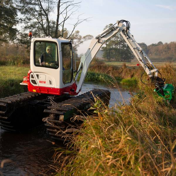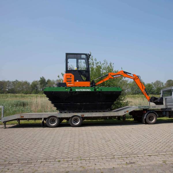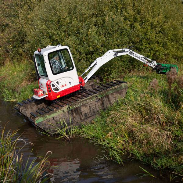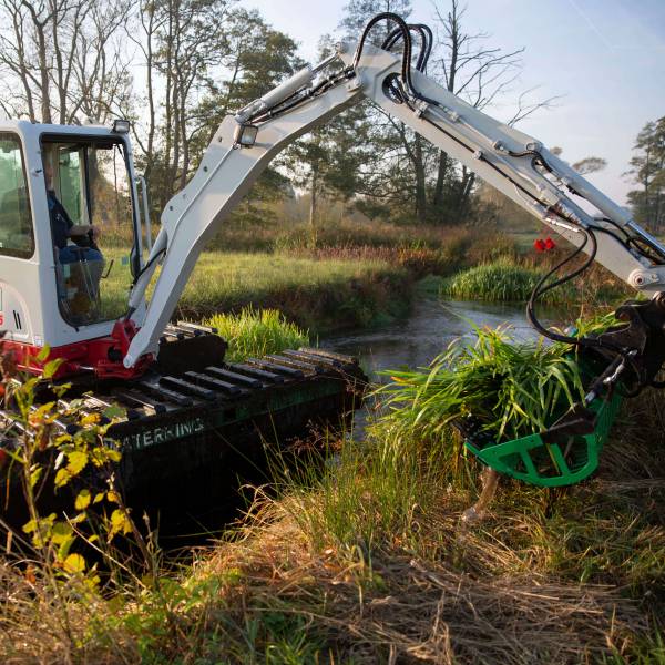 Waterking WK 20 и WK 55 — это две самые компактные амфибийные экскаваторы в нашем парке техники. Эти машины массой 2,0 и 5,5 т предназначены для выполнения дноуглубительных и покосных работ и идеально подходят для обслуживания узких водных каналов. Оптимальное решение в ситуациях, когда водоём слишком мелкий для косильно-толкающей лодки или когда выполнение работ с берега невозможно.