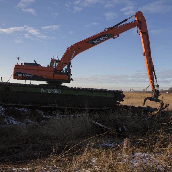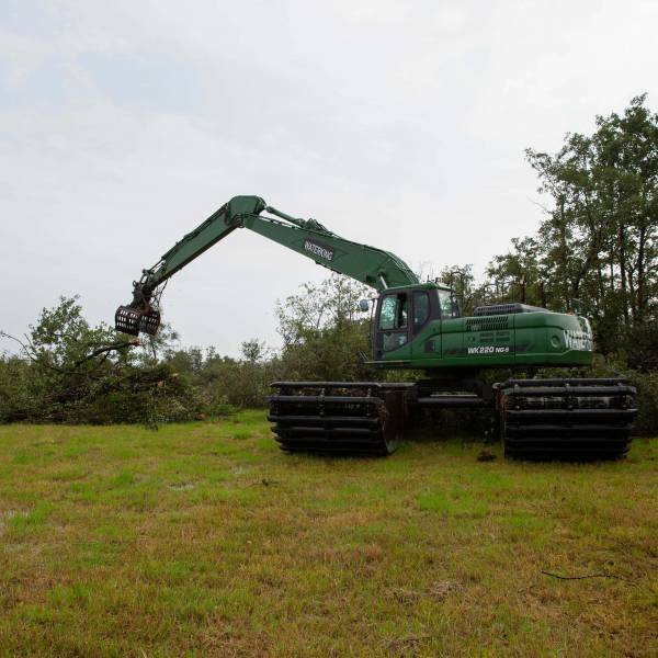 WK 220 — это универсальный болотный кран с широкой сферой применения. Машина обладает высокой мощностью, что позволяет использовать различное навесное оборудование, включая экскаваторные ковши, сортировочный грейфер, мульчер и дноуглубительный насос.