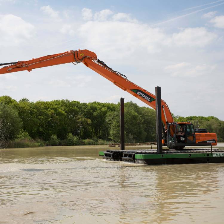 Машины могут оснащаться боковыми понтонами, а также промежуточными понтонами (между гусеницами). Это обеспечивает дополнительную устойчивость и делает работу на воде ещё более эффективной. Waterking комплектуется стандартной стрелой, но может изготавливаться с различными конфигурациями стрелы.